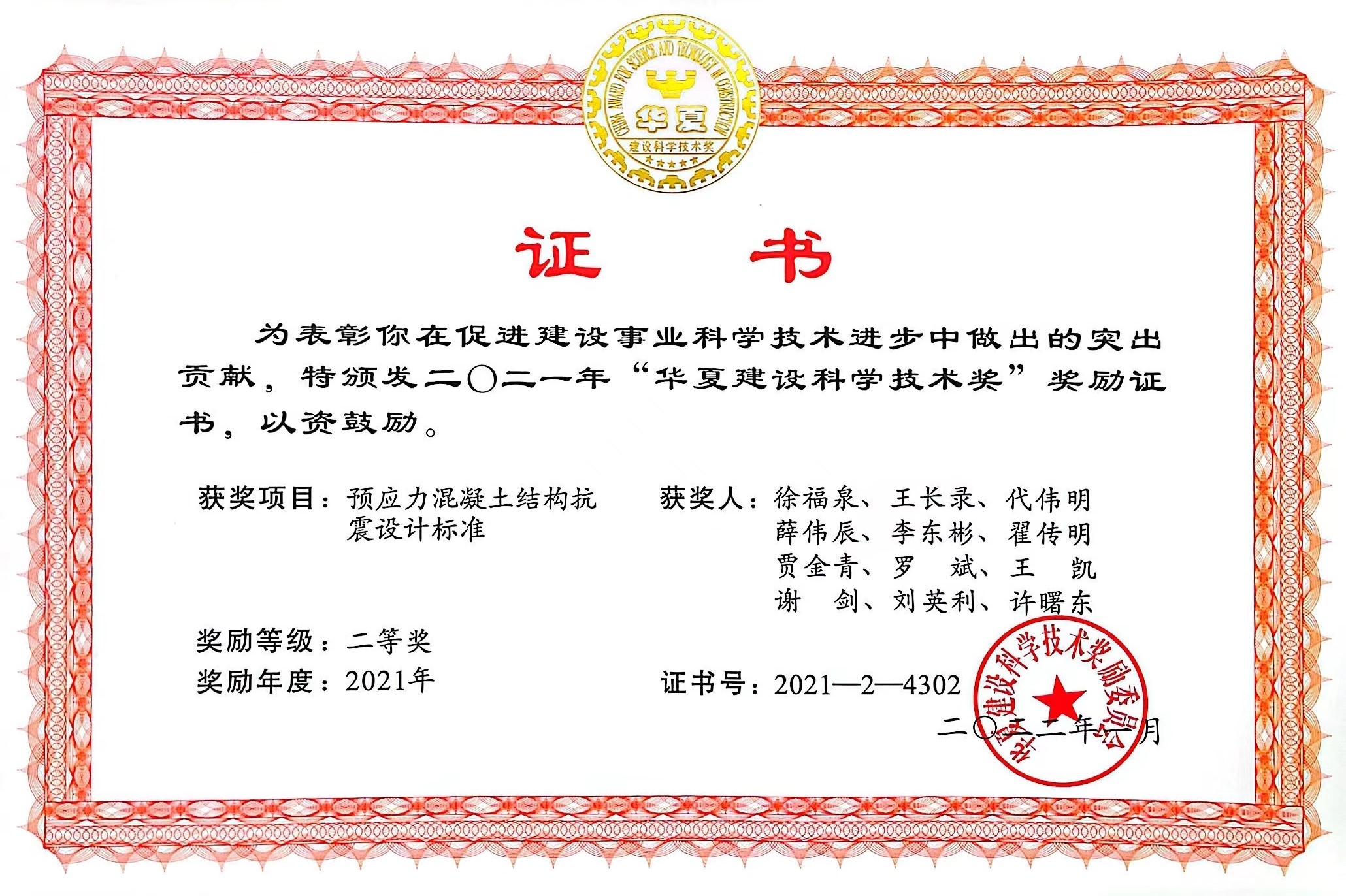 近日,由公司與中國建筑科學研究院共同主編的《預應力混凝土結構抗震設計標準》JGJ/T40-2019榮獲2021年度“華夏建設科學技術獎”二等獎。