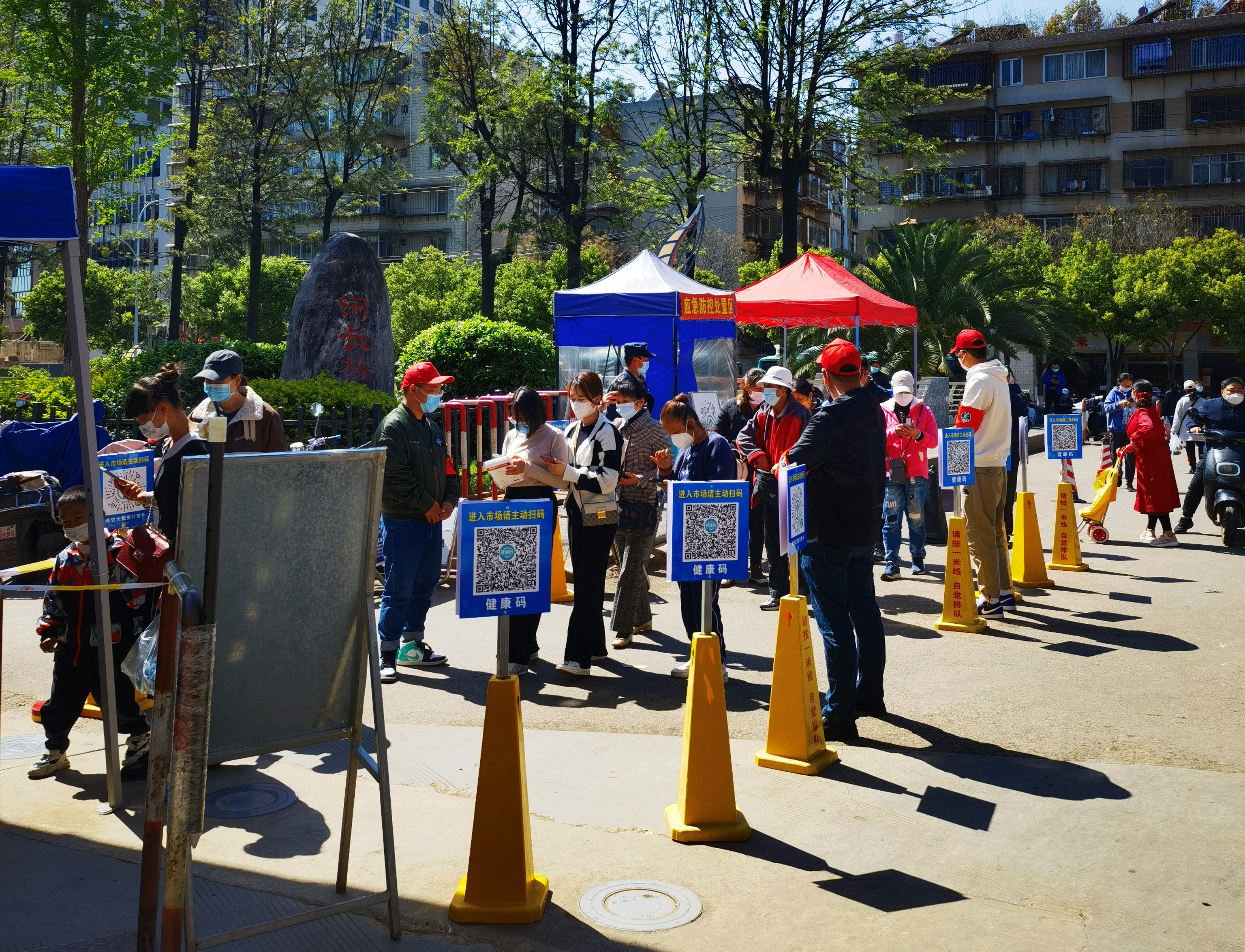 公司黨委結合市場實際情況,將黨員先鋒隊劃分為6個小組,每組10人,在劃分進出通道的基礎上,于入口處拉好警戒線設立三或四個通道,會同原有的市場安保和管理人員,分段式檢查所有進入市場的人員的健康碼和行程碼,行程碼帶星號、健康碼非綠色的人員一律禁止進入市場,對沒有手機的人員進行登記,并確保身份證號等相關信息齊全方可允許進入市場。