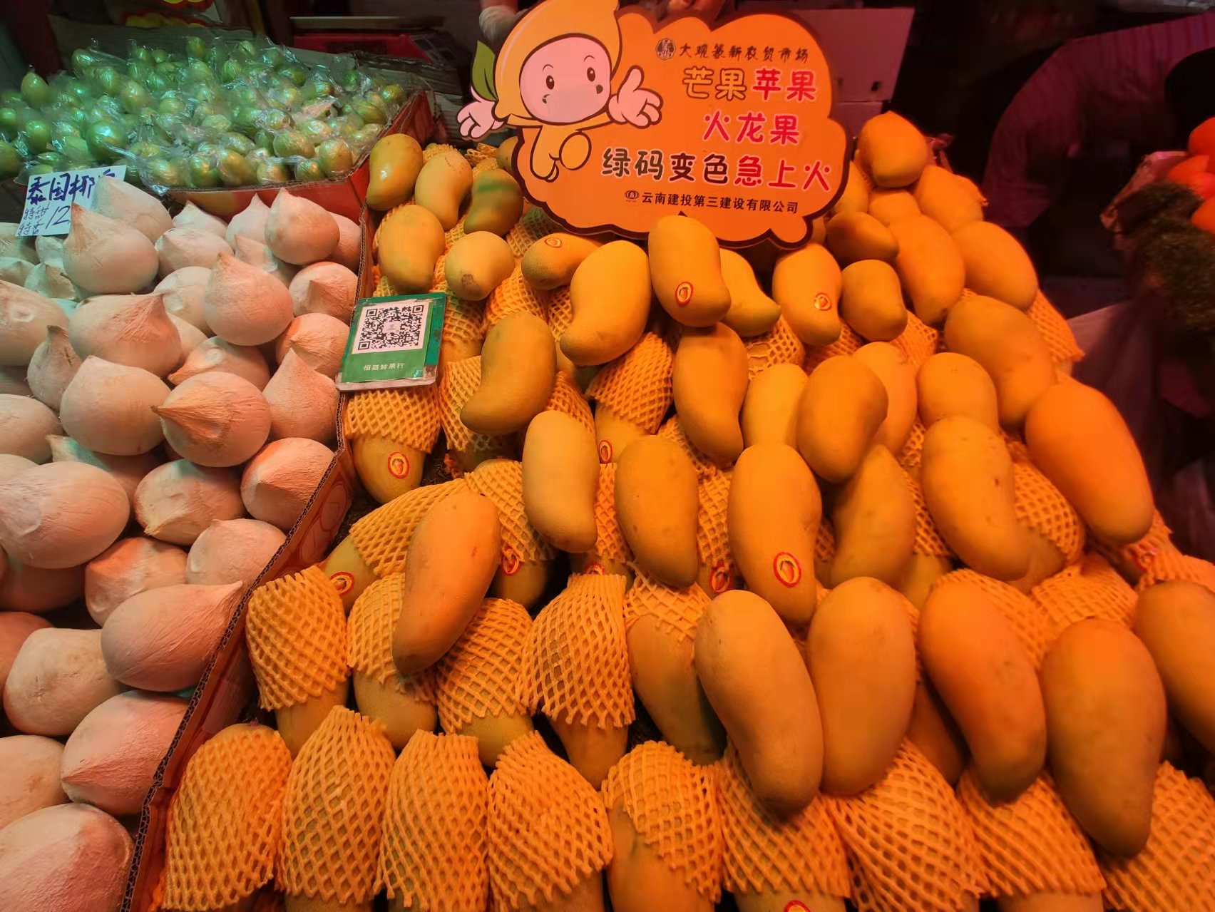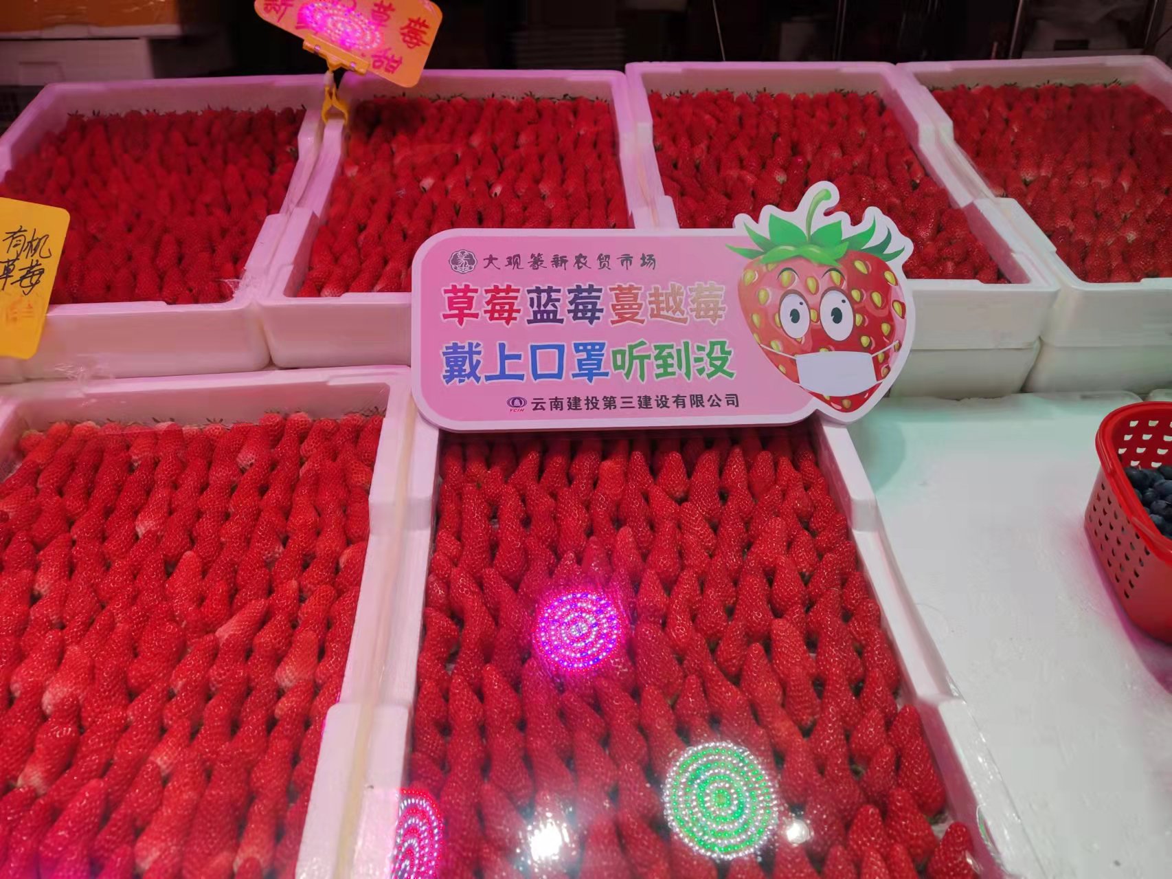 為時刻提醒大家佩戴口罩,做好防護個人防護,大觀篆新農貿市場緊跟新潮流風向標,根據不同的售賣商品制作各種Q趣可愛的萌語標牌,水果攤上“草莓藍莓蔓越莓 戴上口罩聽到沒”、“芒果蘋果火龍果 綠碼變色急上火”,蔬菜攤上“油菜韭菜大白菜 不打疫苗你最菜”,瓜果攤上“黃瓜南瓜大冬瓜 防疫到位頂呱呱”、“茄子黃瓜配青菜 戴上口罩最厲害”,肉類攤上“牛肉羊肉和豬肉 打疫苗的最優秀”、“鹵雞醬肉小豬肘 誰沒口罩誰最丑”等。一句句朗朗上口的順口溜,配上呆萌可愛的果蔬肉蛋卡通圖像,讓人眼前一亮,下意識檢查自己口罩是否戴好。