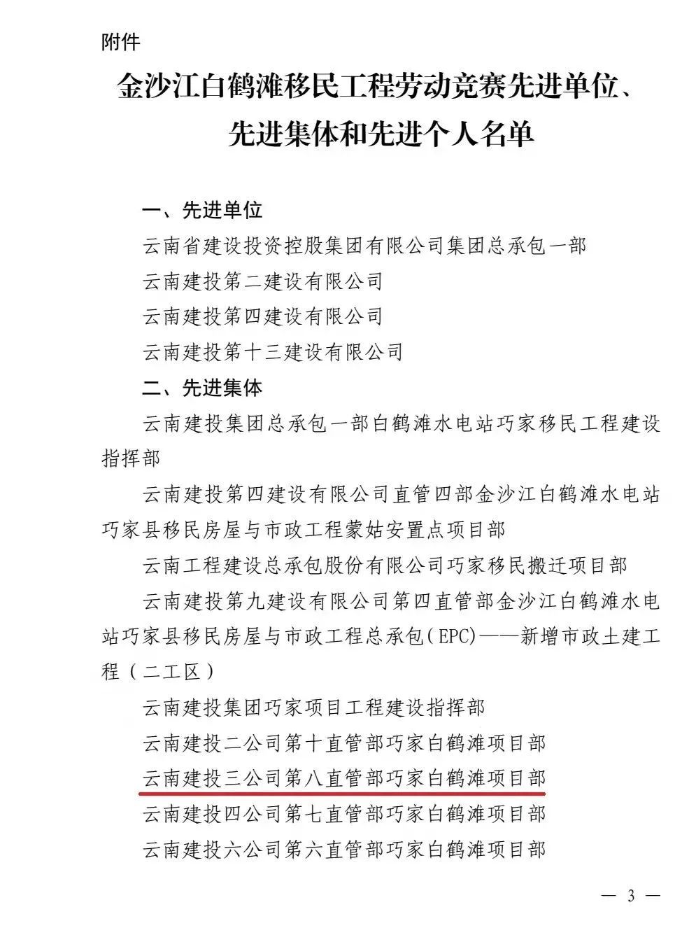 近日,云南省總工會和云南省建設投資控股集團有限公司聯合發文,通報表揚金沙江白鶴灘移民工程勞動競賽先進單位、先進集體及先進個人。公司第八直管項目部榮獲先進集體,公司總經理助理、第十一直管項目部經理施正東,第五直管項目部副經理張勇以及第三直管項目部項目經理何明亮榮獲先進個人。