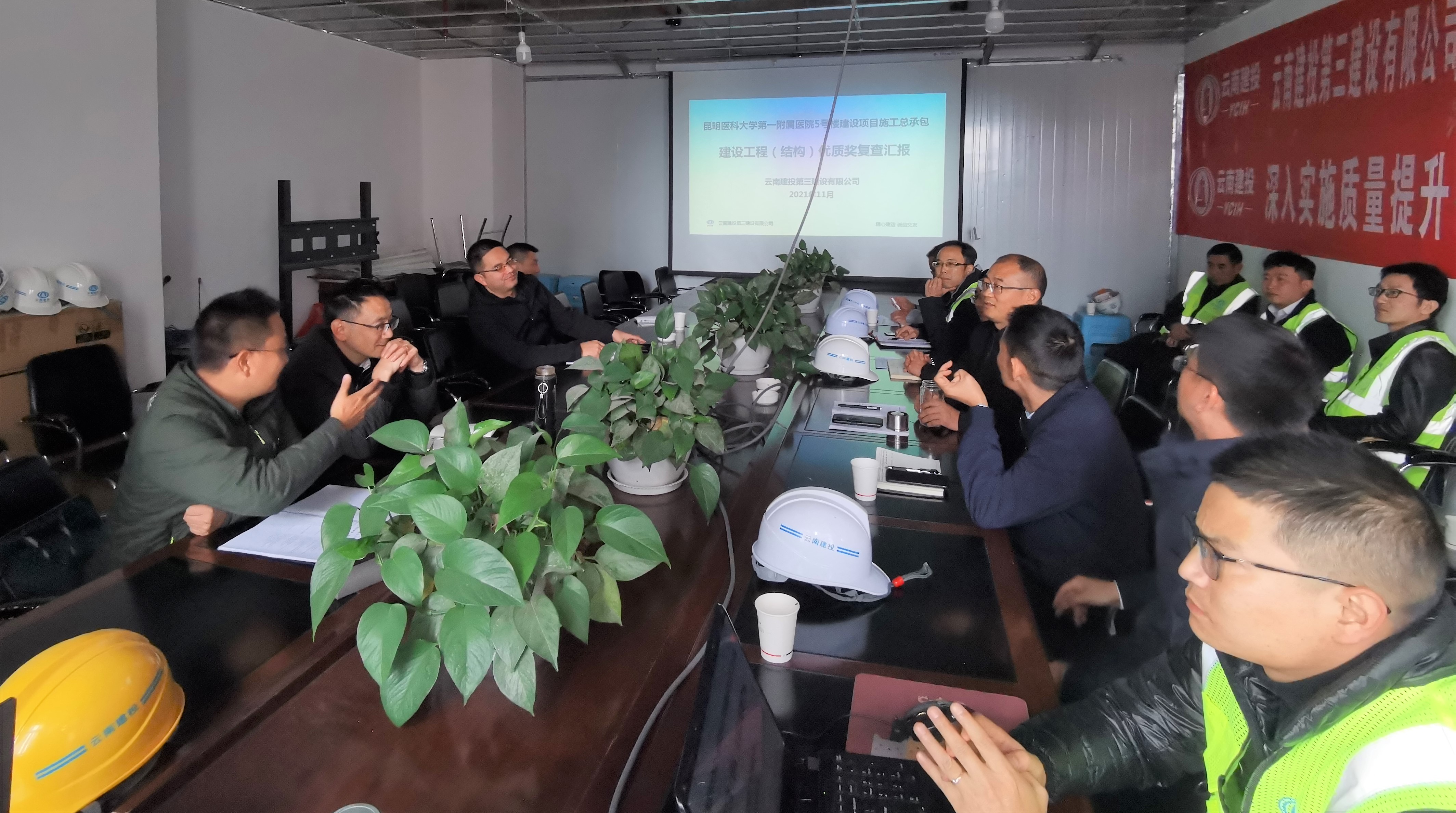 集團專家組認真聽取了項目部匯報,對現場進行了深入檢查,分別對項目立項審批、規劃、環保、智能建設工程系統等資料進行了核查,并對昆明醫科大學第一附屬醫院5號樓的實體質量進行現場復查,就5號樓項目申報魯班獎的前期策劃給予了指導性建議及意見。
