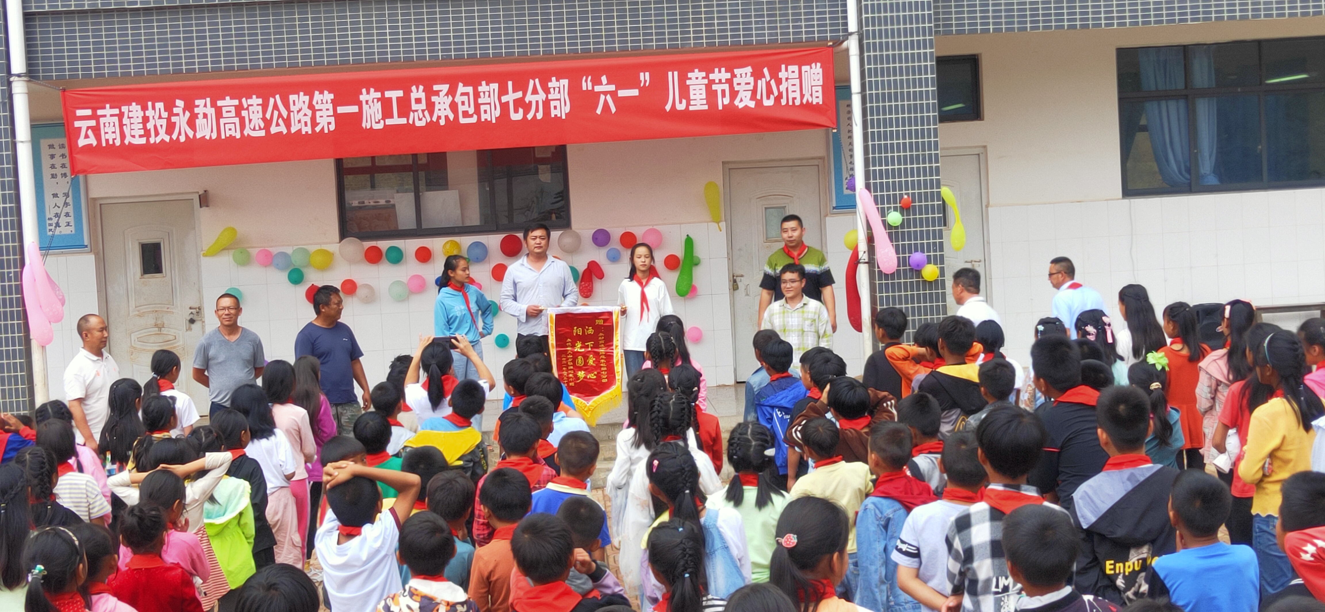 公司路橋市政直管一部項目管理人員來到秧田溝小學,戴上紅領巾與同學們一起進行摸象鼻、猜謎語、成語接龍、趣味接力跑......游戲結束后,項目部為同學們發放了學習用品和慰問金并致以節日的祝福。