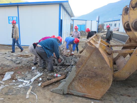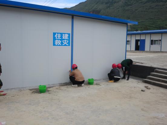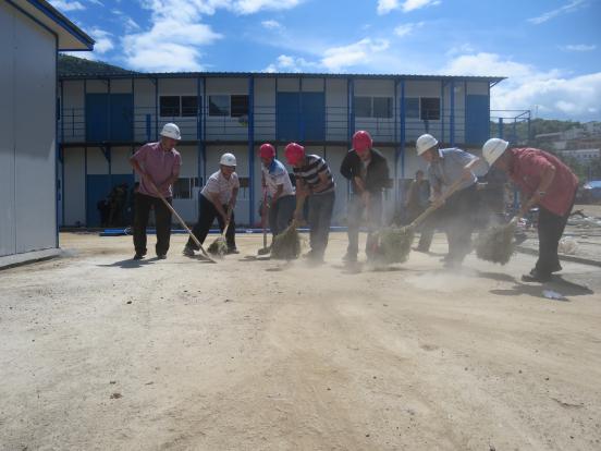 ? ? “我們一定要完成好工作任務(wù),決不給集團抗震救災(zāi)指揮部的工作拖后腿。”王永鈿迅速將突擊隊員分成4個工作小組,一組搬運現(xiàn)場剩余材料,一組負責(zé)場地的清鏟清掃,一組負責(zé)活動板房墻面、門窗的清洗,一組則幫助搭設(shè)廚房設(shè)施、安放課桌板凳等。
