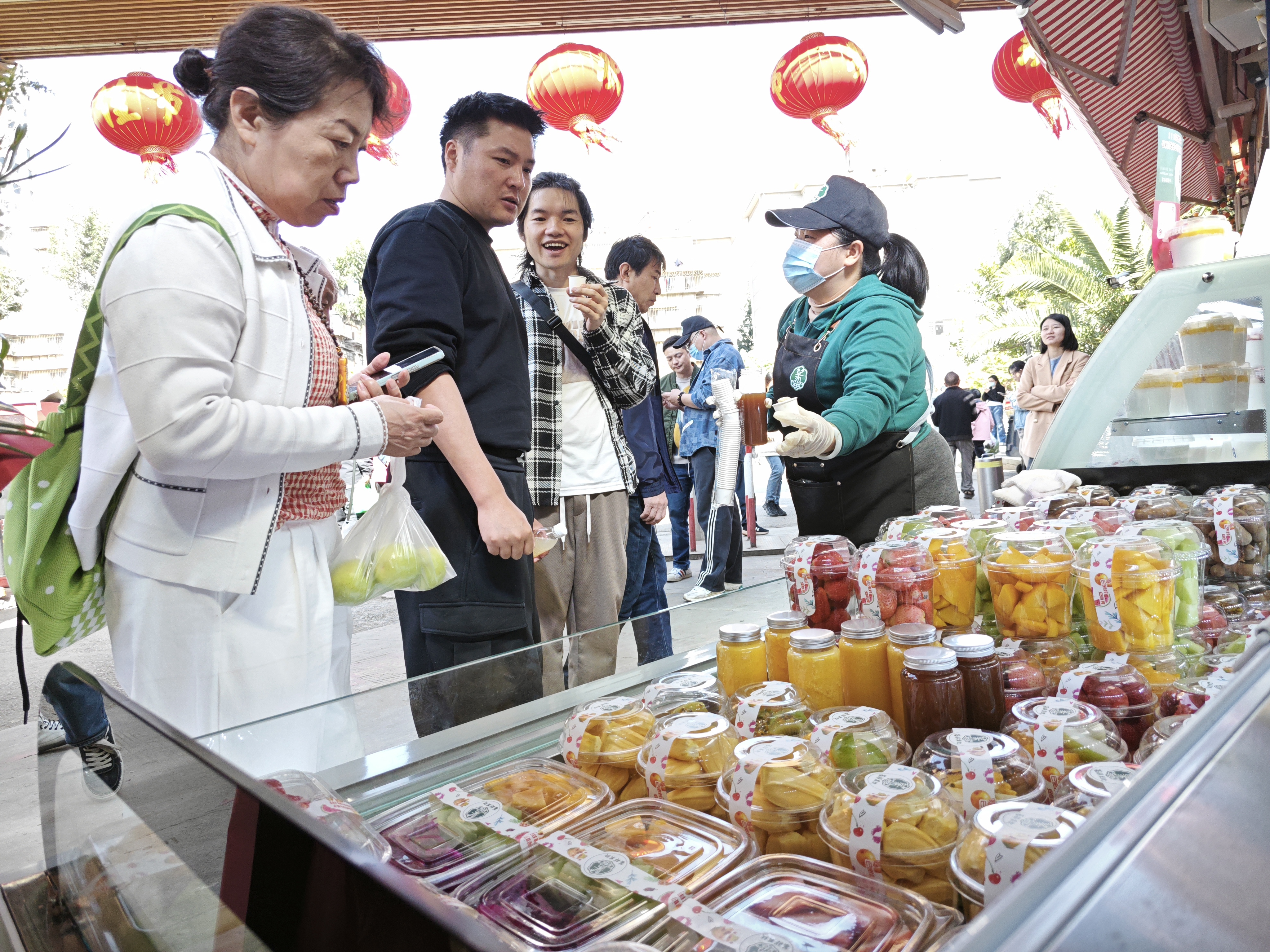 上午9時,位于市場一號大棚的“篆鮮果飲”迎來了首批顧客。20平方米的明檔操作間內,身著統一制服的加工員們佩戴著手套和口罩,熟練地進行著現場作業。攤位前,消費者絡繹不絕,臉上洋溢著期待的笑容,紛紛停下腳步,被各式各樣、品種齊全且品質優良的鮮果切、椰奶凍、鮮榨果汁所吸引。工作人員熱情地招呼著來往的顧客,詳細介紹著各種水果和果汁的獨特之處。整個攤位充滿了歡聲笑語,洋溢著濃濃的煙火氣,為市場增添了一抹別樣的生機與活力。