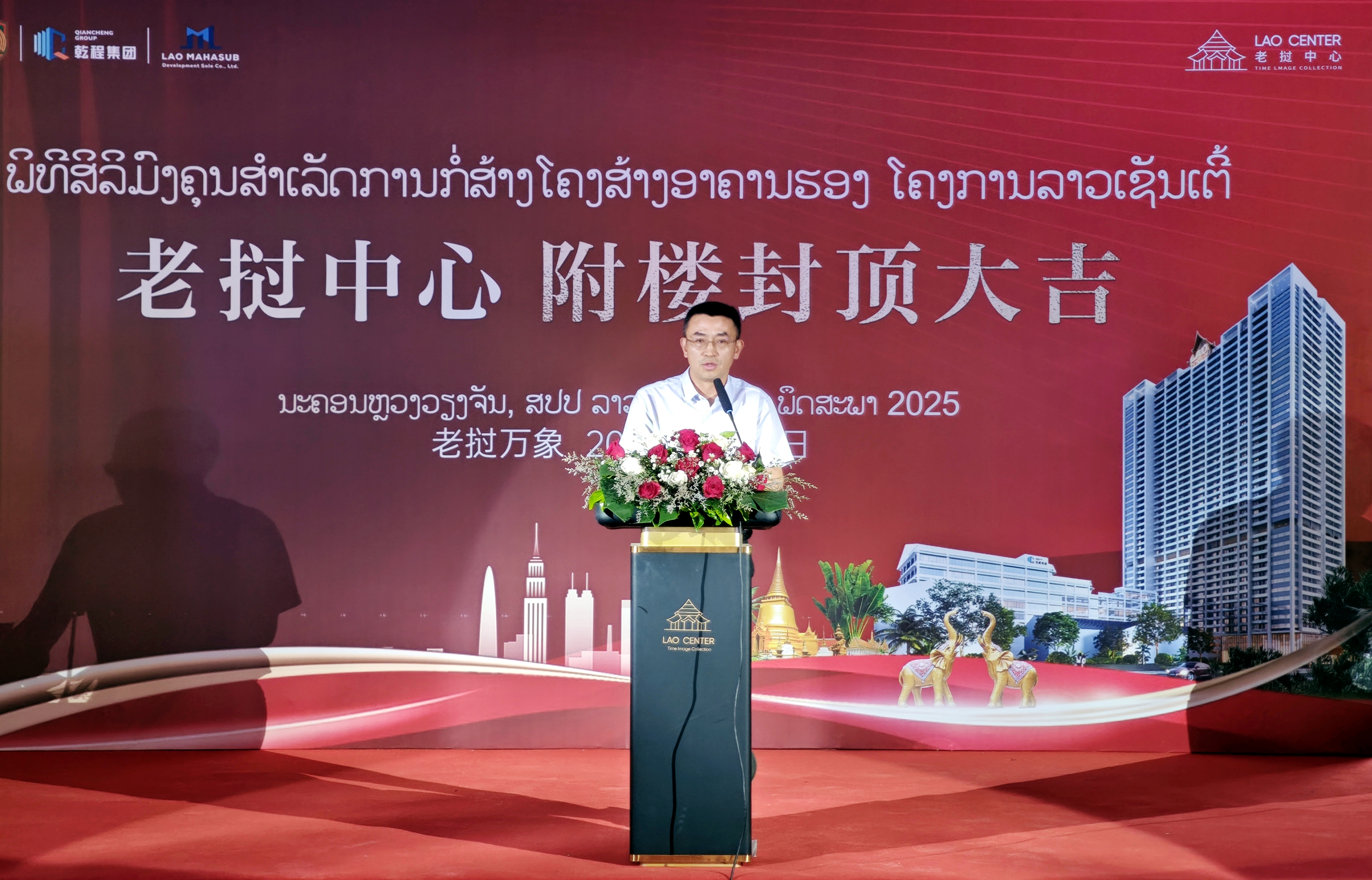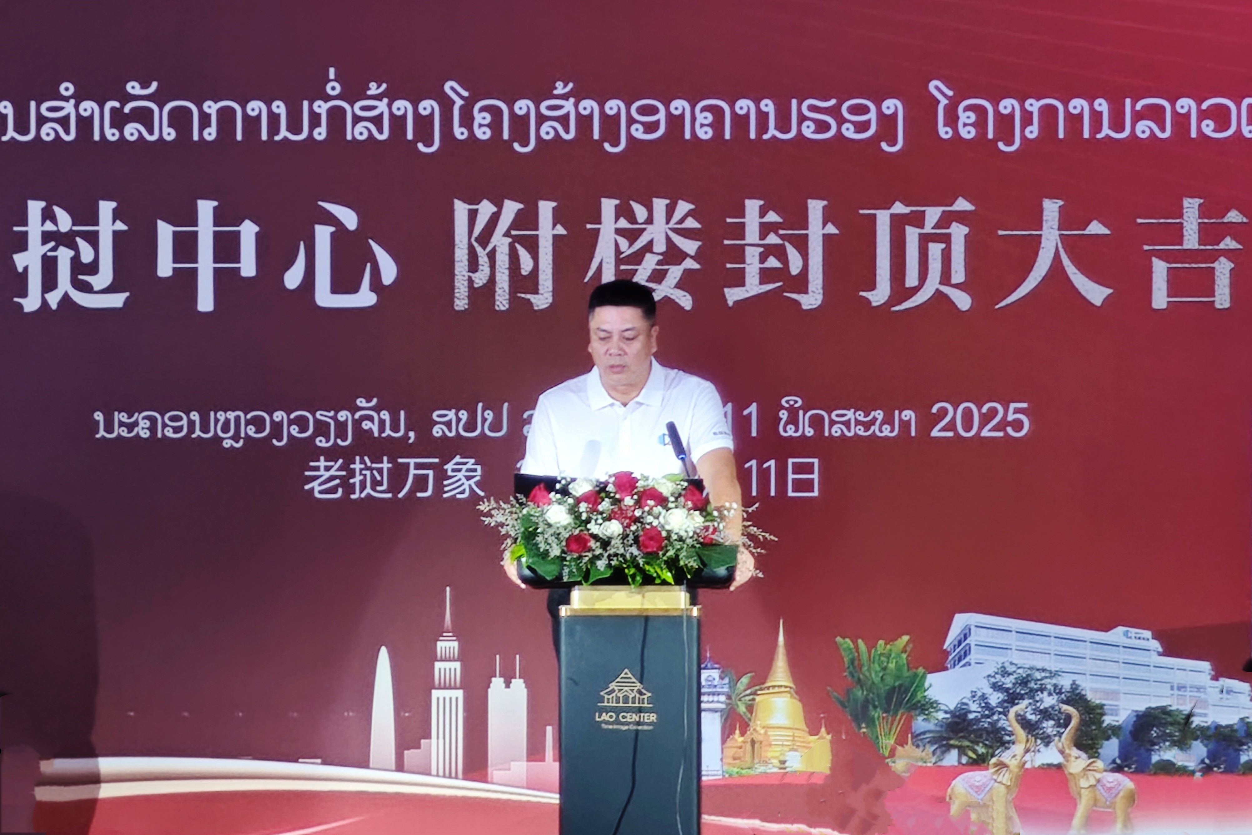 洪高明上臺致辭,向長期以來關心支持項目建設的老撾政府、社會各界以及全體建設者的辛苦付出表示衷心感謝。他指出,附樓的順利封頂,是項目建設歷程中的一個重要里程碑。老撾中心項目自開工建設以來,始終秉持高標準、高質量的建設理念,克服了諸多困難與挑戰,建成后將成為老撾城市新地標之一,將進一步促進中老兩國在相關領域的合作與交流。